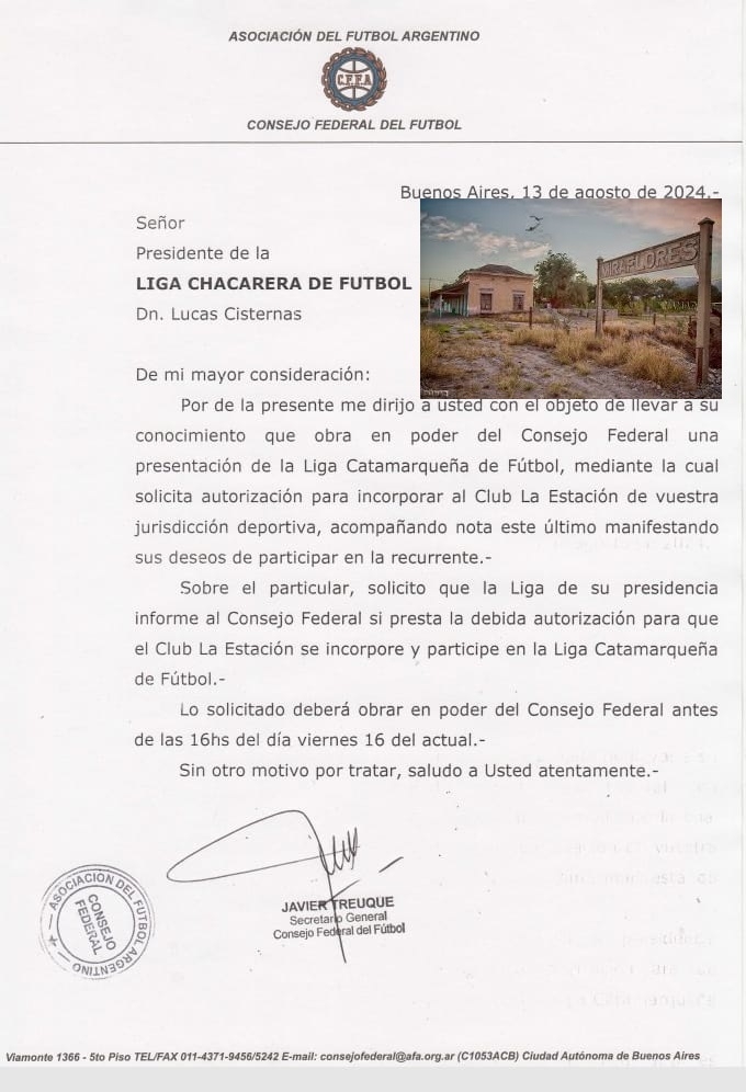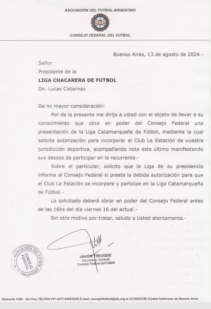 Puntualmente, desde Las Chacras señalan que “la CD no puede dar una autorización para que la Estación ‘se incorpore y participe’ de la Liga Catamarqueña, porque esa decisión debe adoptarla una asamblea extraordinaria”, insistieron, sin precisar la eventual citación al resto de los clubes afiliados para una convocatoria en ese sentido.