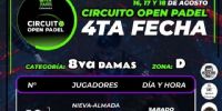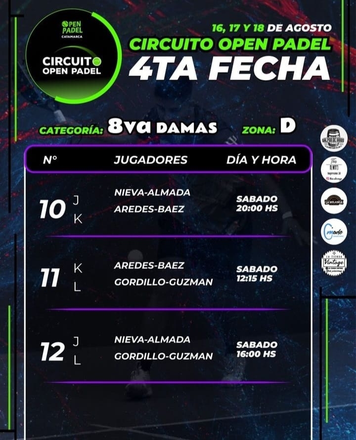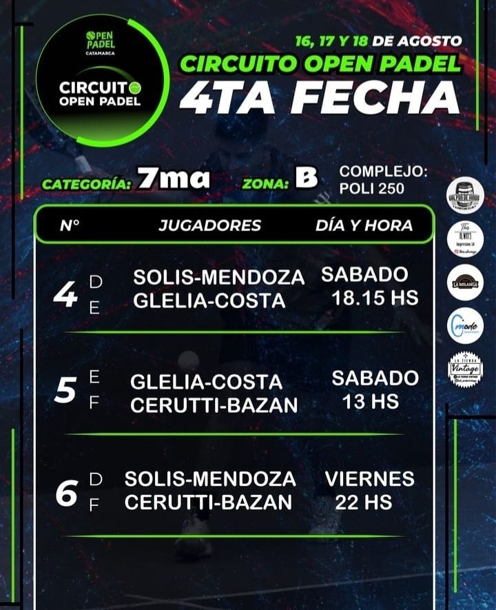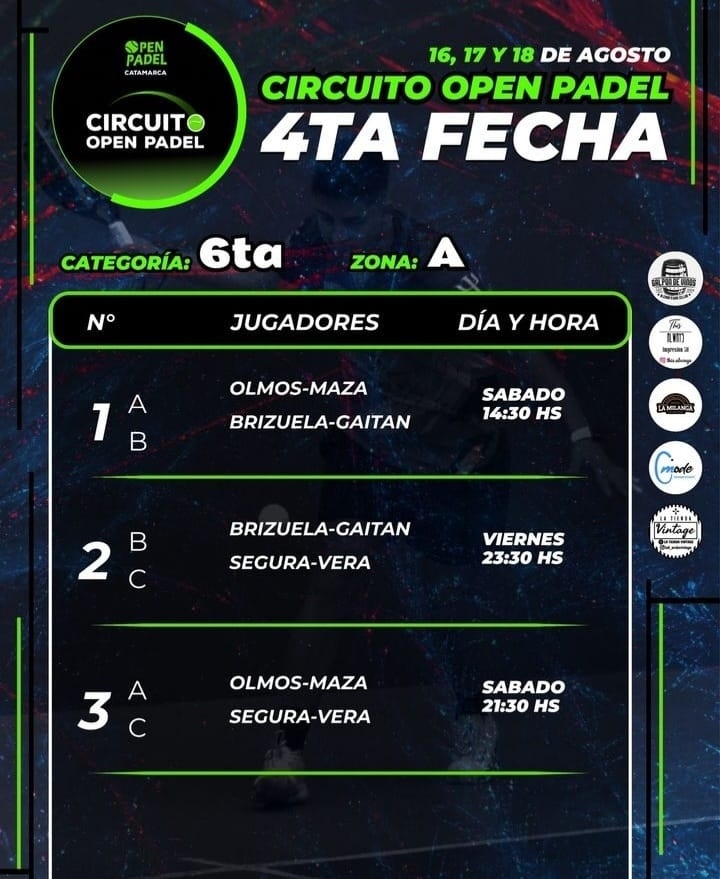 En la fecha anterior, jugada antes de las vacaciones de Julio, hubo éxito de Mónica Cabrera y Cristian Aguilera, por sobre Felipe y René Maza, en 5ta; triunfo de los juveniles Benjamín "Chury" Rodriguez y Martín "Bebo" Olmos ante Ramiro Sieber (de La Merced) y Marcos Collantes. Completando 7ma, con Fede Acosta y Fede Fernández, como campeones, tras la victoria con Tony Salazar y Facundo Palacio; y el 8va, que cayó en manos de la dupla Matías Nogues-Andrés Soria, tras imponerse a Alejo Acosta y Alejo Merep.