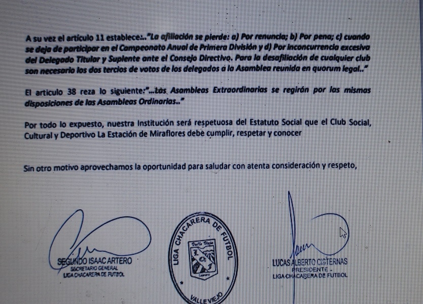 “Por todo los expuesto –concluyen Cisternas y Artero, remarcando que- nuestra institución será respetuosa del Estatuto Social, que el Club Social, Cultural y Deportivo La Estación de Miraflores debe conocer, cumplir y respetar”.