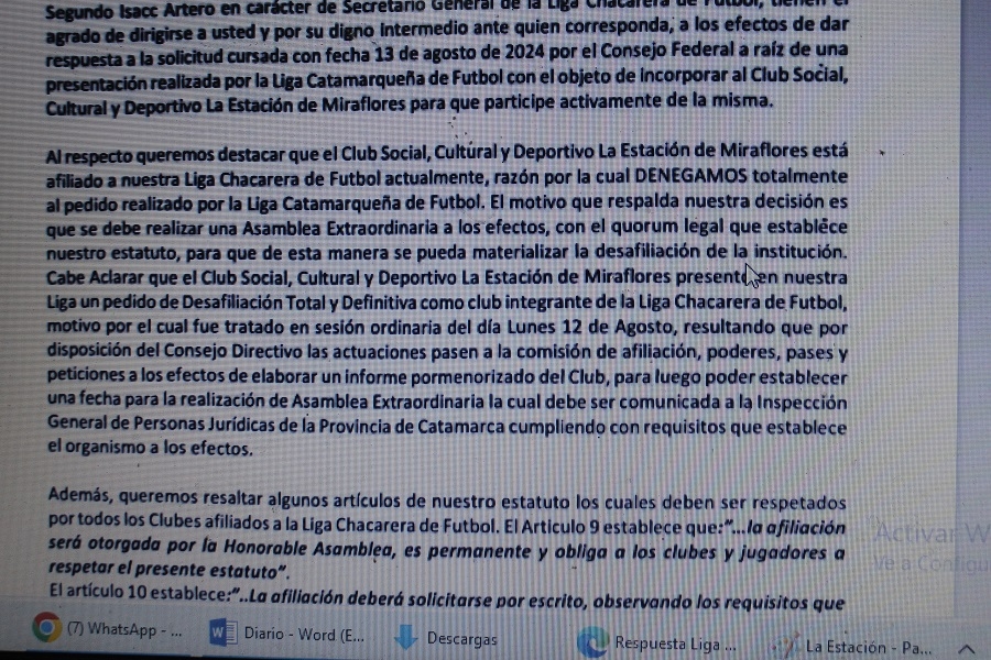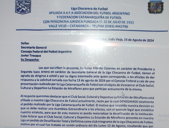 Precisan además que el “pedido de desafiliación total y definitiva” de La Estación como integrante de la Liga Chacarera fue tratado “en sesión ordinaria del lunes 12 de agosto, resultando que por disposición del CD las actuaciones pasen a la Comisión de Afiliación, Poderes, Pases y Peticiones, a los efectos de elaborar un informe pormenorizado…, para luego poder establecer una fecha para la realización de la Asamblea Extraordinaria, la que debe ser comunicada a Inspección General de Personas Jurídicas (IGPJ) de la provincia de Catamarca, cumpliendo con los requisitos que establece ese organismo a los efectos”.
