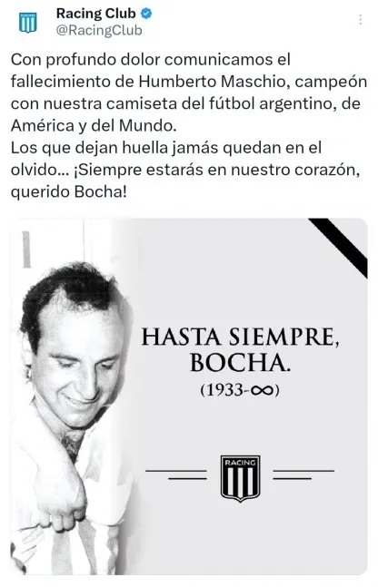 Lamentablemente, el Racing de sus amores quien informó su fallecimiento, en vísperas a su choque en el plano internacional donde Maschio tantas alegrías le dio. "Con profundo dolor comunicamos el fallecimiento de Humberto Maschio, campeón con nuestra camiseta del fútbol argentino, de América y del Mundo. Los que dejan huella jamás quedan en el olvido... ¡Siempre estarás en nuestro corazón, querido Bocha!", expresó la institución.