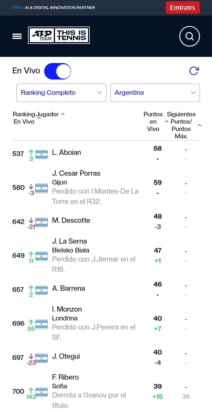 La Serna escaló 11 puestos en el Ránking Mundial ATP, y quedó en el 649° del escalafón, merced a lo logrado las últimas 5 actuaciones en 6 semanas (sólo faltó a la cita en Bélgica para descansar), con título y dos semis en Serbia, más dos 8vos también en dicho país y Polonia.