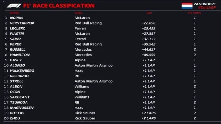 El hombre de McLaren fue superado en los primeros 200 metros por el local, agravando su mayor problema en esta temporada: las salidas. Sin embargo, se notó que a partir de la décima vuelta el neerlandés comenzó a tener dificultades con su auto, perdiendo agarre y sin poder mantener un buen ritmo. Lando no tuvo mayores dificultades para superarlo y para sacar una amplia diferencia en la cima. Para poner en contexto, esta fue la carrera con una mayor diferencia entre primero y segundo en toda la temporada.