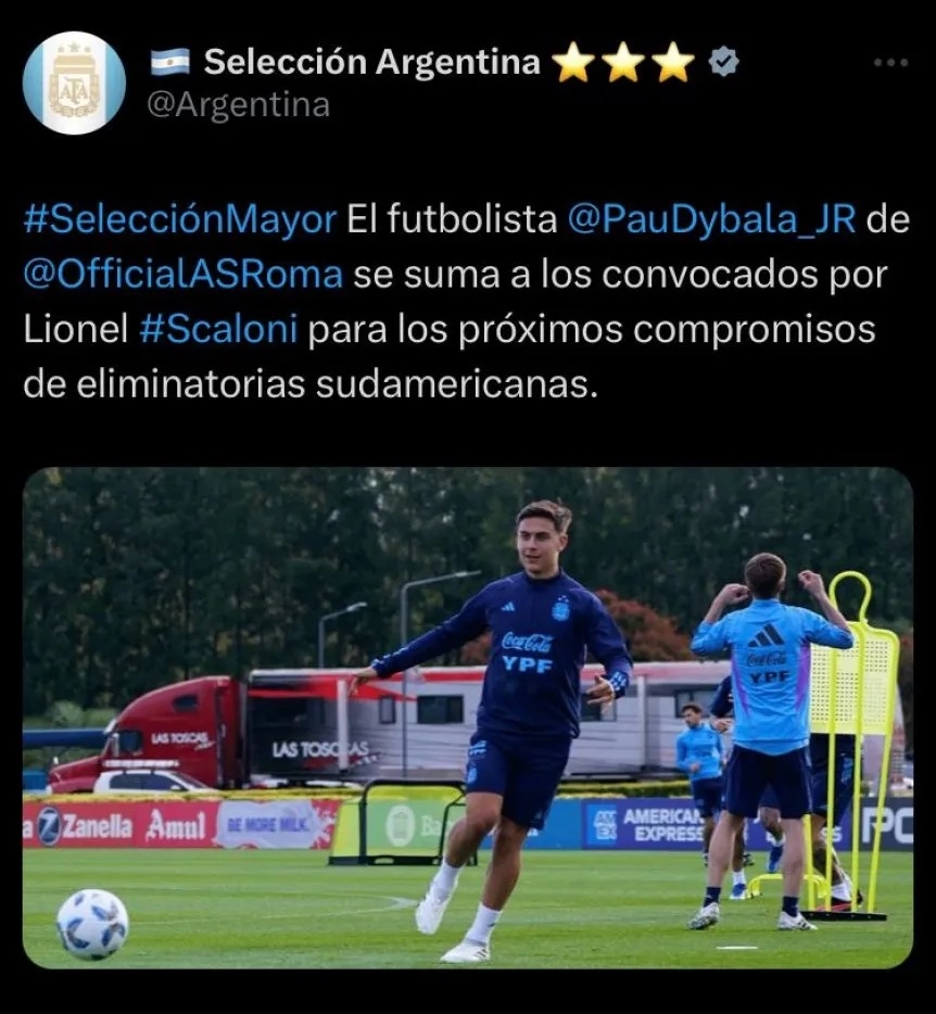 "El futbolista Paulo Dybala de Roma se suma a los convocados por Lionel Scaloni para los próximos compromisos de eliminatorias sudamericanas", informó la Albiceleste en las redes sociales. Su citación se debe a que Lionel Messi, que se lesionó de gravedad el tobillo durante la final ante Colombia, todavía no pudo volver a entrenar en Inter Miami y el cordobés ingresó en su lugar.