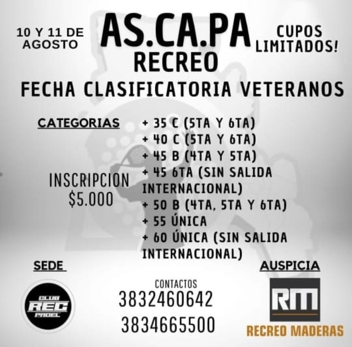 Y en Recreo (La Paz), el otro fin de semana, del 10 y 11 de agosto, jugará los Caballeros, en el club Rec Pádel, con +35 y +40 C, +45 B y C, +50 B, +55 Única y el +60, en donde anún están abiertas las inscripciones 3832 46 06 42.