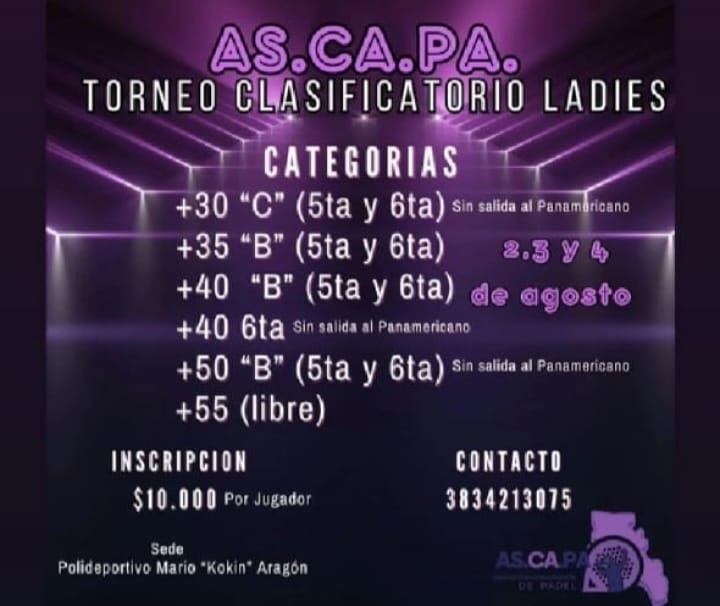 Intentando meterse a jugar por Catamarca en em Torneo Argentino de APA, que se jugará en Córdoba del 13 al 15 de Septiembre. En la Capital, de viernes a domingo se está disputando el clasificatorio de Ladies, con sede el Poli Mario "Kokin" Aragón, y las categorías +30 B y C, +40 B y C, +50 B, y +55 libre.