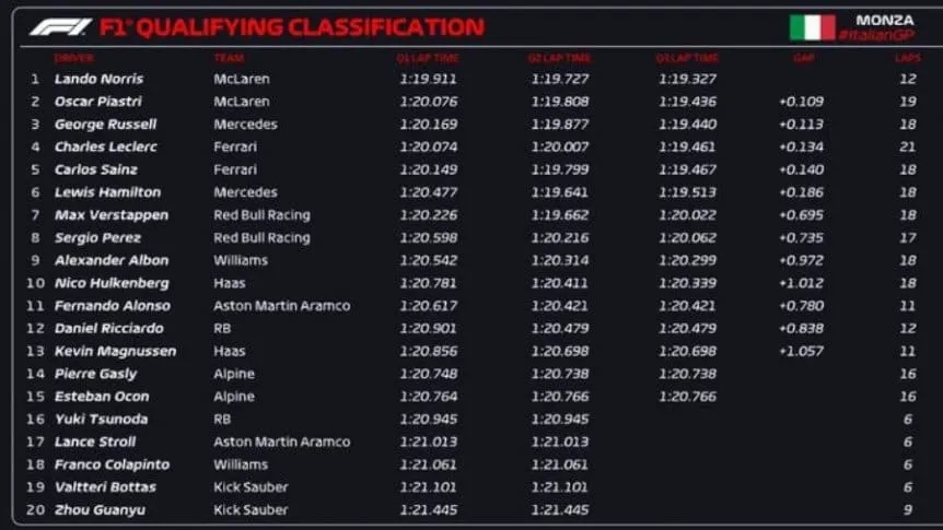 La clasificación del Gran Premio de Italia de la Fórmula 1, en la que hizo su estreno el piloto argentino Franco Colapinto para la escudería de Williams, se llevó a cabo en el autódromo ubicado en el parque de la villa real de Monza. Fue la decimosexta qualy de la temporada 2024. Tras la Q1, el pilarense quedó en el puesto número 18. Lando Norris, el piloto de McLaren, se quedó con la pole position. Además, Oscar Piastri y George Russell completaron el podio.