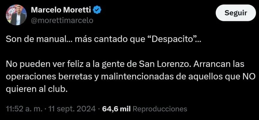 "Los sueldos están al día, cuando asumimos se debían cuatro meses y las primas de todo 2023. Y los premios de la Sudamericana. Pagamos el cien por cien de todo eso, que era 1.7 millones de dólares, y hoy los jugadores están al día. De los 51 jugadores profesionales que tiene San Lorenzo, 48 están al día y solamente tres tienen una mínima deuda. Estamos hablando con ellos. Lo único que se les debe a los jugadores son los premios por haber clasificado a la Copa Libertadores, que no llega a 300 mil dólares. Hemos pagado los premios por haber ganado los dos partidos de la Libertadores. La relación con el plantel es bárbara. Por eso me llamó la atención y escribí eso en las redes. Hace muchos años que estoy en el fútbol y sé cuando viene una opereta", amplió como descargo.