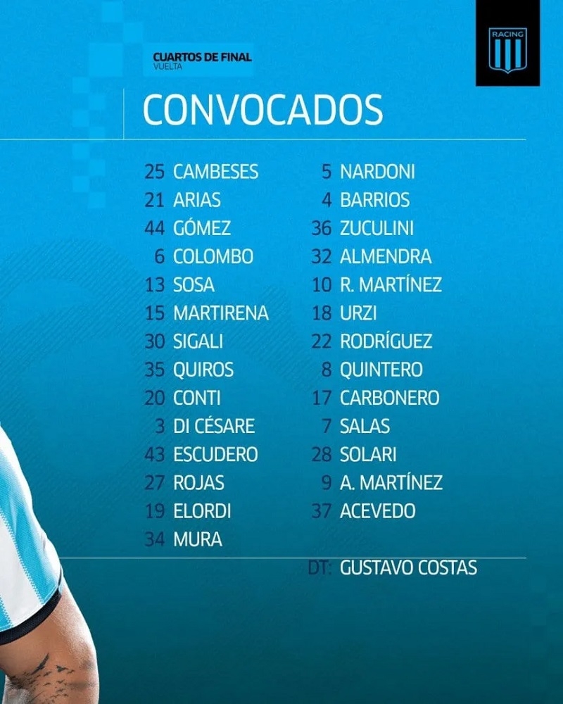 Del medio hacia adelante, Costas tiene una incógnita que deberá resolver antes del silbatazo inicial: si mantiene a Juan Fernando Quintero, de deslucido rendimiento en la ida, o apuesta por la inclusión en el frente de ataque de Roger Martínez, quien podría acompañar a Adrián Maravilla Martínez y Maximiliano Salas. Mientras que en el círculo central se seguirán moviendo Agustín Almendra y Juan Nardoni.