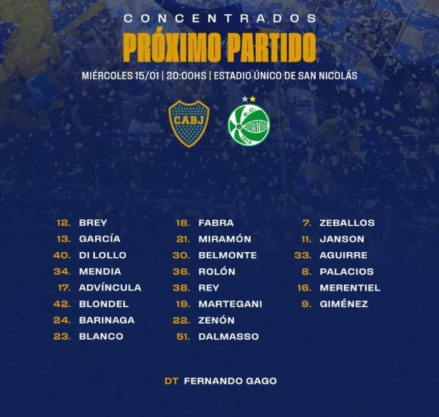 Tras el entrenamiento matutino de hoy y con el plantel ya definido mientras espera por más refuerzos (Ander Herrera, Agustín Marchesín y Williams Alarcón), Fernando Gago presentó la lista de convocados de Boca de cara al amistoso de este miércoles –a las 20 hs., en San Nicolás- ante Juventude, que será el primer partido -no oficial- del 2025, y sorprendió con la ausencia de varias figuras.