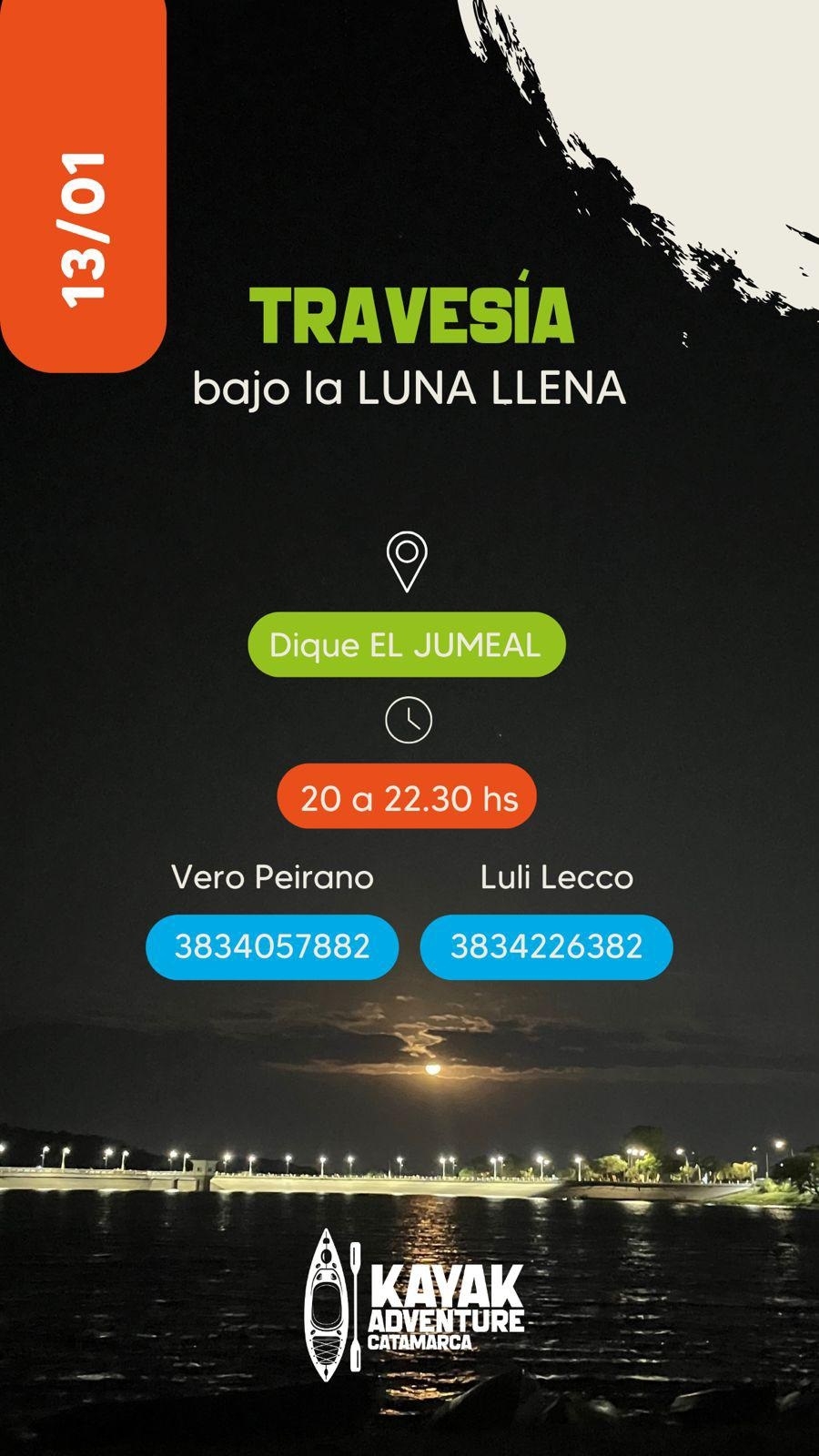 Y, para el lunes 13, pero ya en dique El Jumeal, de esta Capital, de 20 a 22.30 hs., se anunció la segunda y motivante "Travesía Bajo la Luna Llena".