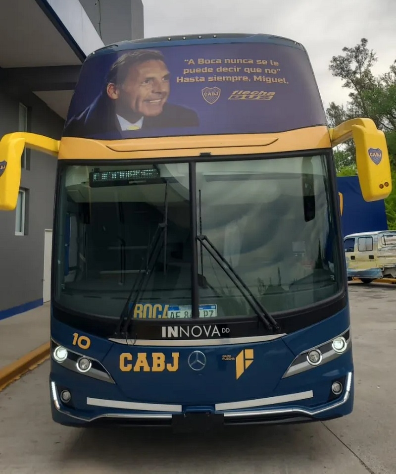 El micro de Boca que traslada a los jugadores presentó un ploteo en homenaje a Miguel Ángel Russo.