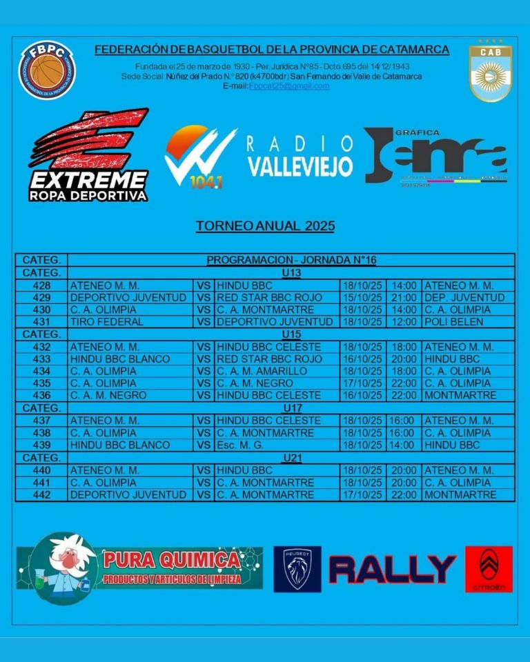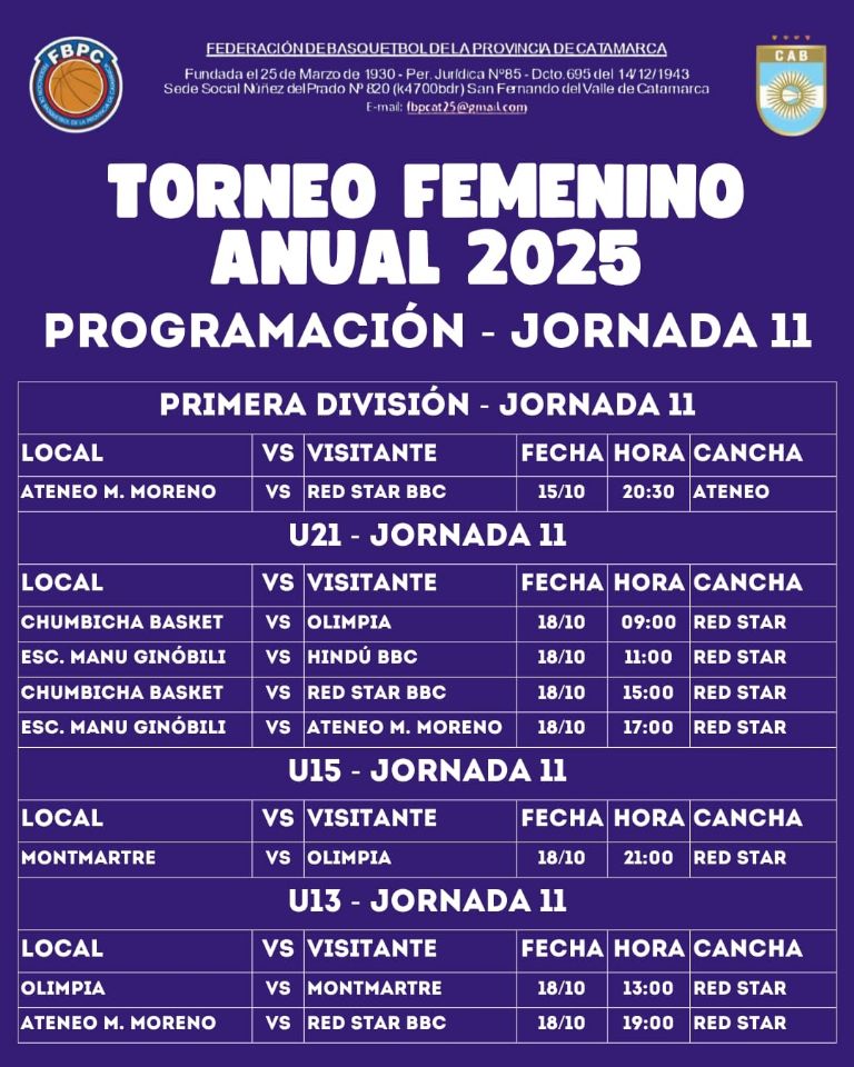 Este miércoles, comienza la Jornada 11 para el Básquet Femenino y la 16 para la Divisiones Formativas en el Torneo Anual 2025 de la Federación de Básquetbol de la Provincia de Catamarca.