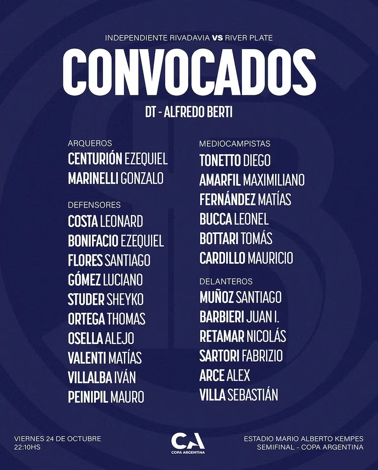 Por su parte, Independiente Rivadavia accedió a esta instancia frente al conjunto de Núñez tras superar a Tigre por 3-1 en los cuartos de final. Sin embargo, en el Torneo Clausura, el equipo atraviesa un momento irregular, ya que no consigue una victoria desde fines de agosto, sumando desde entonces dos derrotas y cuatro empates, con la reciente caída frente a Banfield como local.