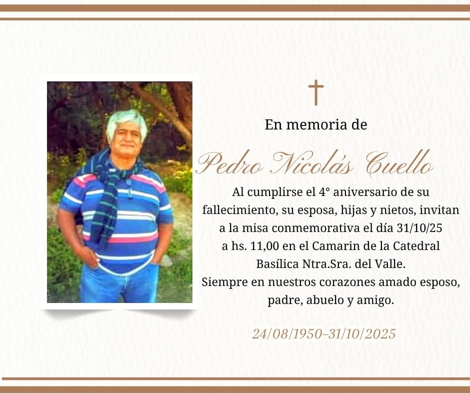 Pedro Nicolás Cuello, al cumplirse el 4to. Aniversario de su fallecimiento, su esposa, hijas y nietos invitan a la misa conmemorativa, a celebrarse el día 31 de octubre (este viernes), a las 11 hs., en el Camarín de la Catedral Basílica Nuestra Señora del Valle.