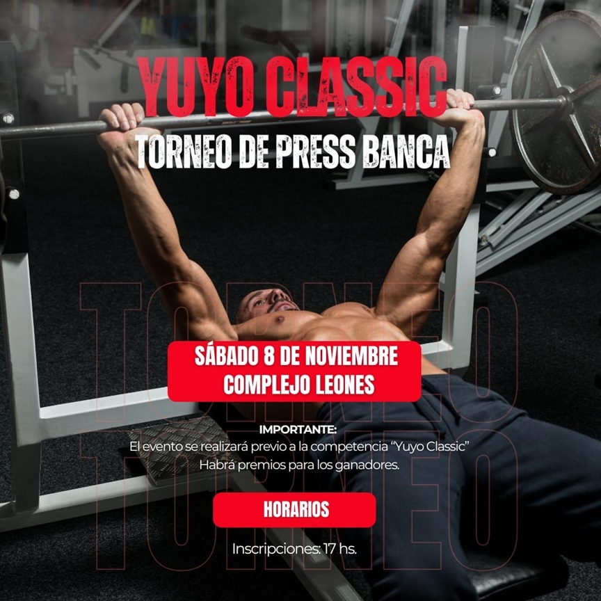 Como atractivo adicional y previo al inicio de la competencia de fisicoculturismo, el evento incluirá un emocionante Torneo de Press Banca en las instalaciones del gimnasio del Complejo “Leones”. Esta competencia está abierta a todos los amantes de los "fierros" y contará con categorías divididas por peso corporal y peso de competencia (barra + discos), tanto para participantes Masculinos como Femeninos.
