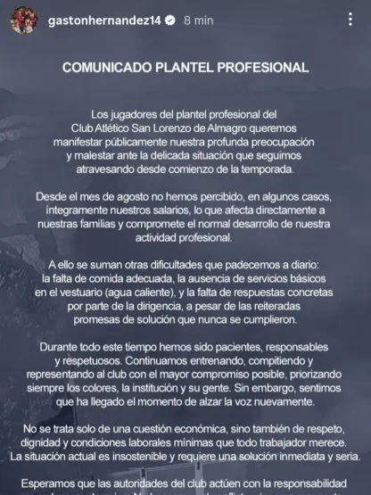 Gastón Hernández, capitán del equipo, compartió el comunicado de todos los futbolistas a través de sus redes sociales.