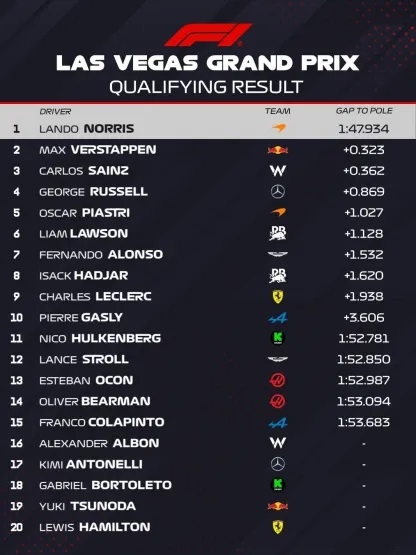 Con una gran actuación que confirma su óptimo presente Lando Norris, el puntero del campeonato, se quedó con el primer puesto en la qualy del circuito callejero de Las Vegas.