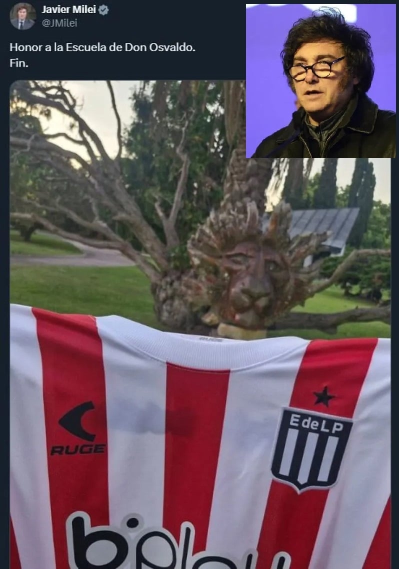 Esta vez, quien lo hizo fue nada menos que el presidente Javier Milei, con un mensaje escueto pero contundente. "Honor a la Escuela de Don Osvaldo“, publicó el mandatario en X con la imagen de una casaca del Pincha flanqueada por un león tallado, en referencia al histórico entrenador Osvaldo Zubeldía multicampeón de América e Intercontinental en 1968 con el conjunto platense.