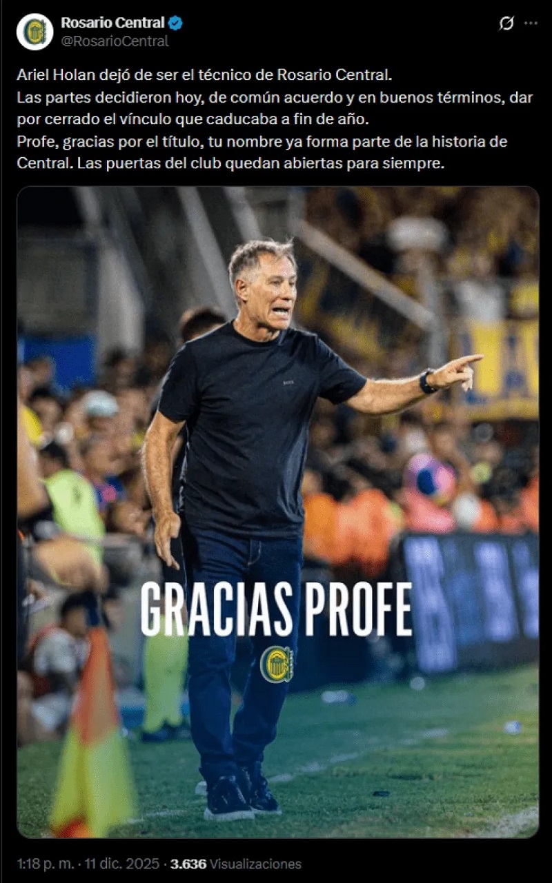 La noticia de la salida de Ariel Holan sacudió a la sección de Rosario pintada de auriazul y retumbó fuerte en el mundo futbolero en general. Cuando todo parecía estar dado para que continuara su proyecto en 2026, con la Copa Libertadores en el horizonte, el club publicó un comunicado en el que anunció la "rescisión de común acuerdo" con el entrenador que lo llevó a liderar la tabla anual y conseguir el título de "campeón de Liga".