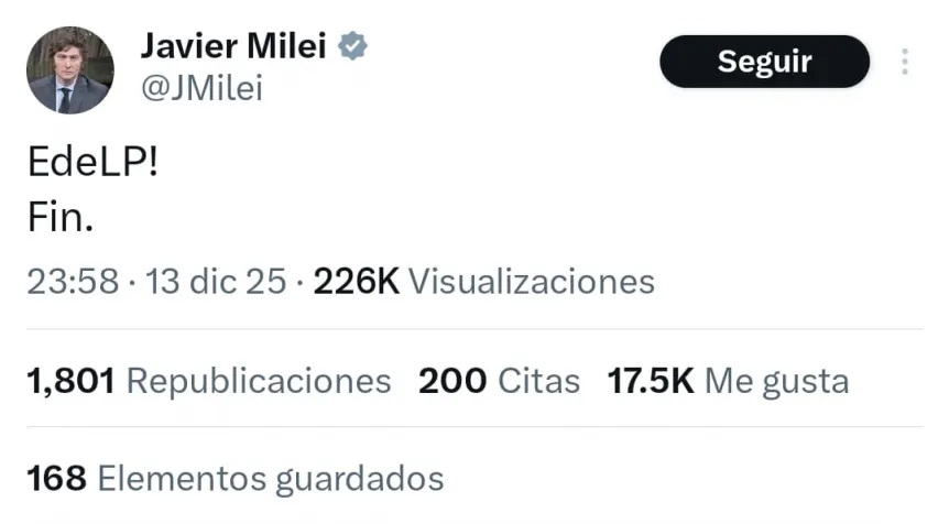 Pocos minutos más tarde, Tapia extendió sus congratulaciones también en redes sociales, dedicado un posteo en su cuenta personal de X (antes conocido como Twitter): "Felicitaciones al plantel, a la Comisión Directiva, a Eduardo Domínguez junto a su cuerpo técnico y los colaboradores de Estudiantes de La Plata por la consagración del Torneo Clausura 2025. Saludos a todos los hinchas y socios del Pincha".