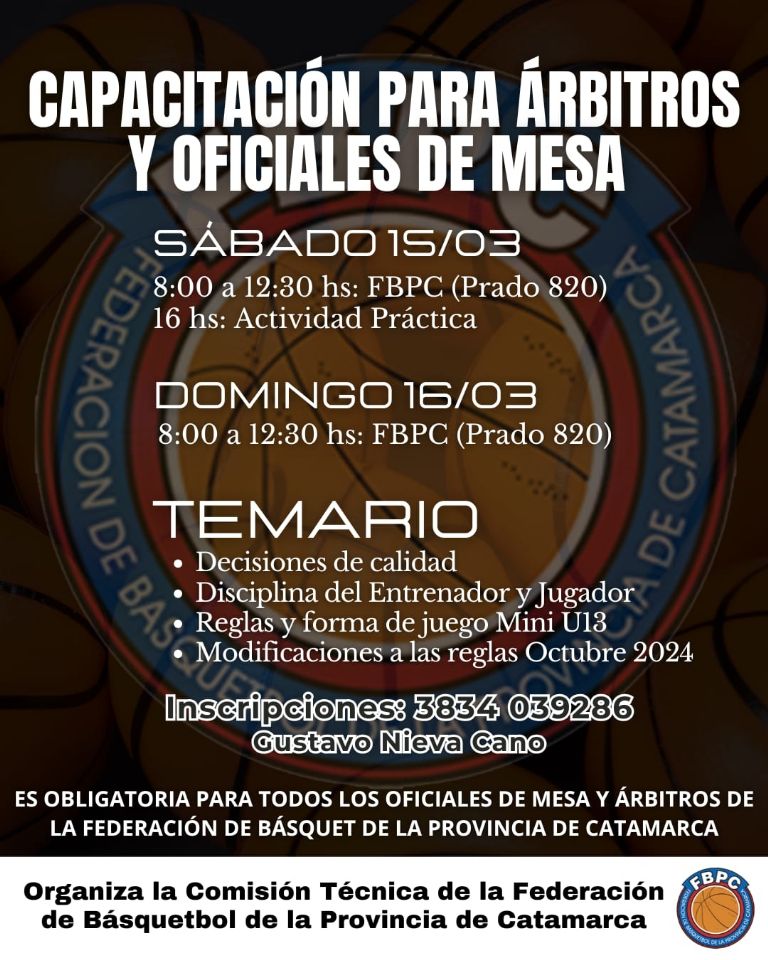 Para poder realizarla, los interesados deben comunicarse al 3834 039286 con Gustavo Nieva Cano para confirmar su inscripción en este curso, en el que se desarrollarán diversas temáticas: Decisiones de calidad; Disciplina del Entrenador y Jugador; Reglas y forma de juego (Mini y U13); Modificaciones a las reglas de Octubre 2024, entre otros.