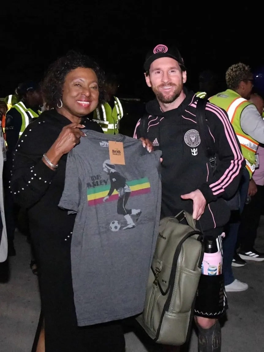 El capitán de las Garzas fue recibido por Olivia Grange, la ministra de Cultura y Deportes de Jamaica, quien le obsequió al argentino una remera de Bob Marley, emblema de la música reggae, jugando al fútbol. Sabido es que el recordado músico era fanático del deporte, por lo que nada mejor que hacerle ese obsequio al mejor jugador del mundo.