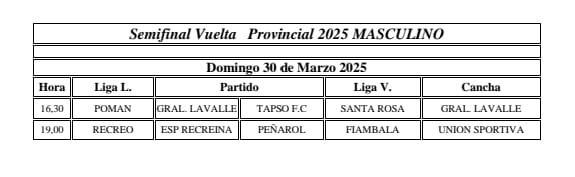 En cancha de Gral. Lavalle, Cólpes de Pomán, 16.30 hs., Lavalle de la Liga Pomanista vs. Tapso FC de la Liga Santarroseña.