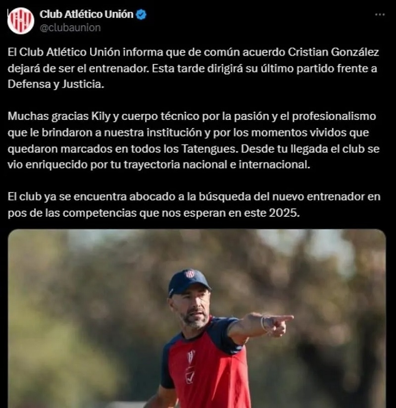 "El Club Atlético Unión informa que de común acuerdo Cristian González dejará de ser el entrenador. Esta tarde dirigirá su último partido frente a Defensa y Justicia".