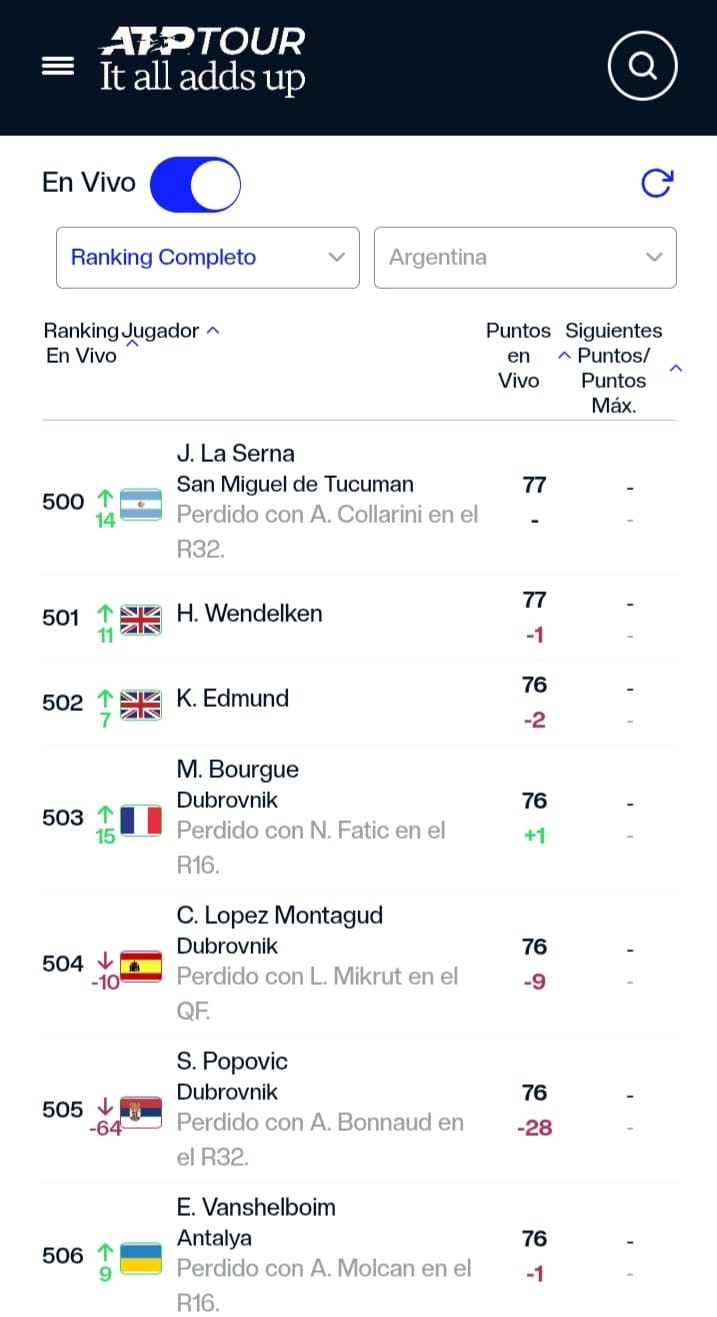 El joven de Catamarca: Manu La Serna, luego de haber recibido la invitación especial (WC), al Challenger de Tucumán; y a pesar de haber caído por 6-4 y 6-2, ante el preclasificado número 1 del torneo: Andrea Collarini el último martes; quedará el próximo lunes en el puesto 500° del Ránking ATP (Asociación de Tenistas Profesionales), tocando de esta manera el puesto más importante de su carrera.