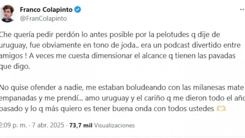 Las declaraciones causaron gran controversia y el pilarense no dudó en pedir disculpas por sus dichos y reiteró su aprecio por el país del lado oriental del Río de La Plata: "Che quería pedir perdón lo antes posible por la pelotudez q dije de Uruguay, fue obviamente en tono de joda.. era un podcast divertido entre amigos! A veces me cuesta dimensionar el alcance q tienen las pavadas que digo".