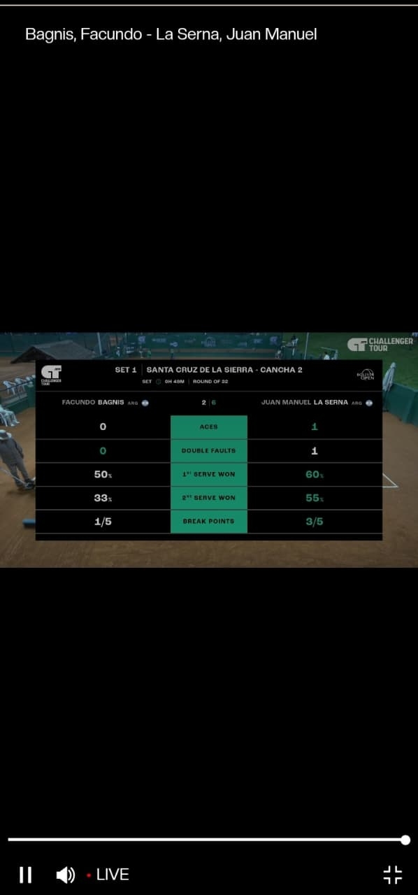 Manu La Serna, número 504° del Mundo, logró en jornada de este martes, el éxito más importante de su carrera, al imponerse en la 1ra Ronda del Challenger 50 de Santa Cruz de la Sierra (Bolivia), por 6-2 y 6-4 al rosarino Facundo Bagnis, que llegó a ser 55° en el escalafón ATP, y participante de los Juegos Olímpicos de Tokio en 2021.