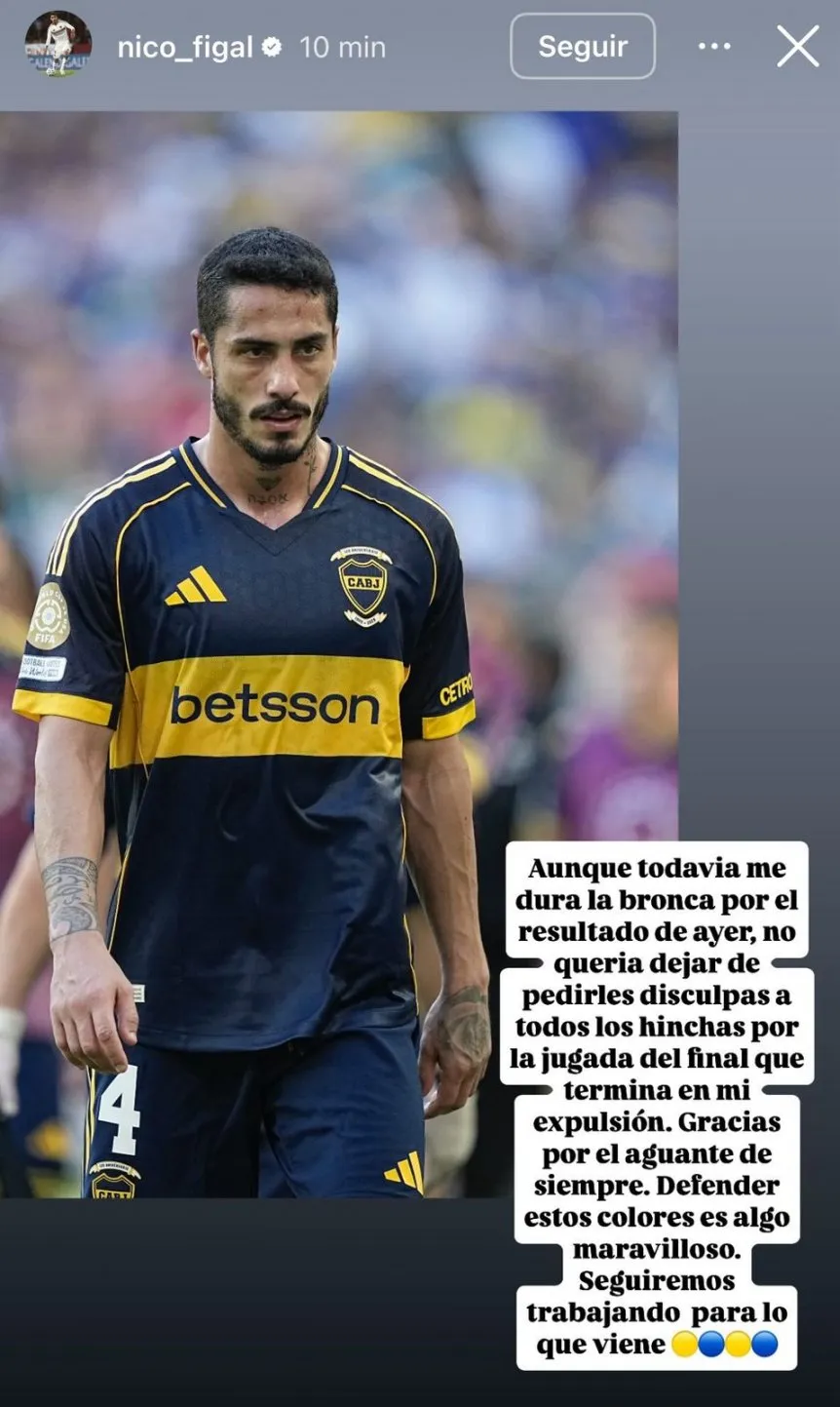 "Aunque todavía me dura la bronca por el resultado de ayer, no quería dejar de pedirle disculpas a todos los hinchas por la jugada del final que termina en mi expulsión", afirmó el zaguero -quien fue titular por primera vez tras seis meses- en una publicación en su cuenta de Instagram.