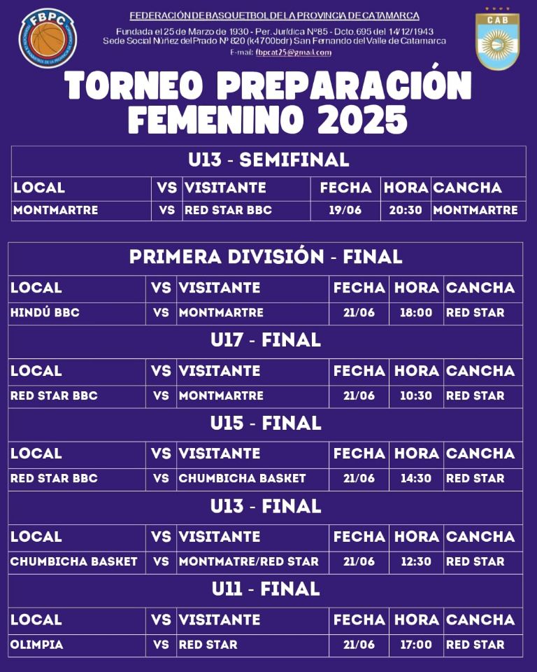 Este sábado, en la cancha de Red Star BBC, se desarrollarán las Finales del Torneo Preparación 2025 para el Básquet Femenino de la Federación de Básquetbol de la Provincia de Catamarca, en Primera División y las cuatro Divisiones Formativas: U11, U13, U15 y U17.