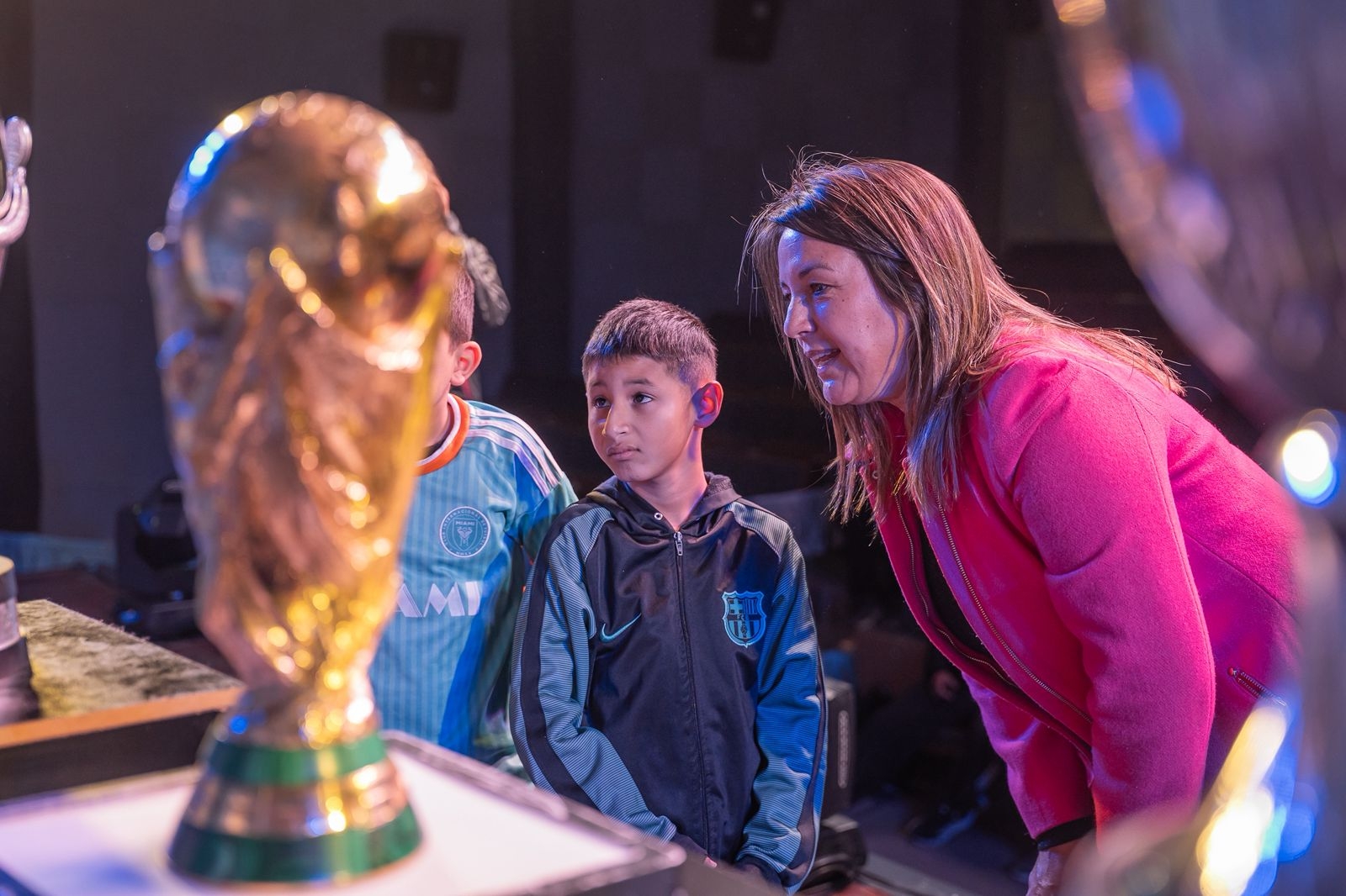 Uno de los momentos más emotivos de la jornada fue la visita de alumnos y alumnas de la Escuela de Las Tejas, quienes llegaron desde esa localidad del interior de Valle Viejo para vivir una experiencia inolvidable. Los pequeños, visiblemente emocionados, pudieron ver de cerca los trofeos que consagraron a la Argentina en el plano internacional, y que tienen a Messi como ídolo máximo.