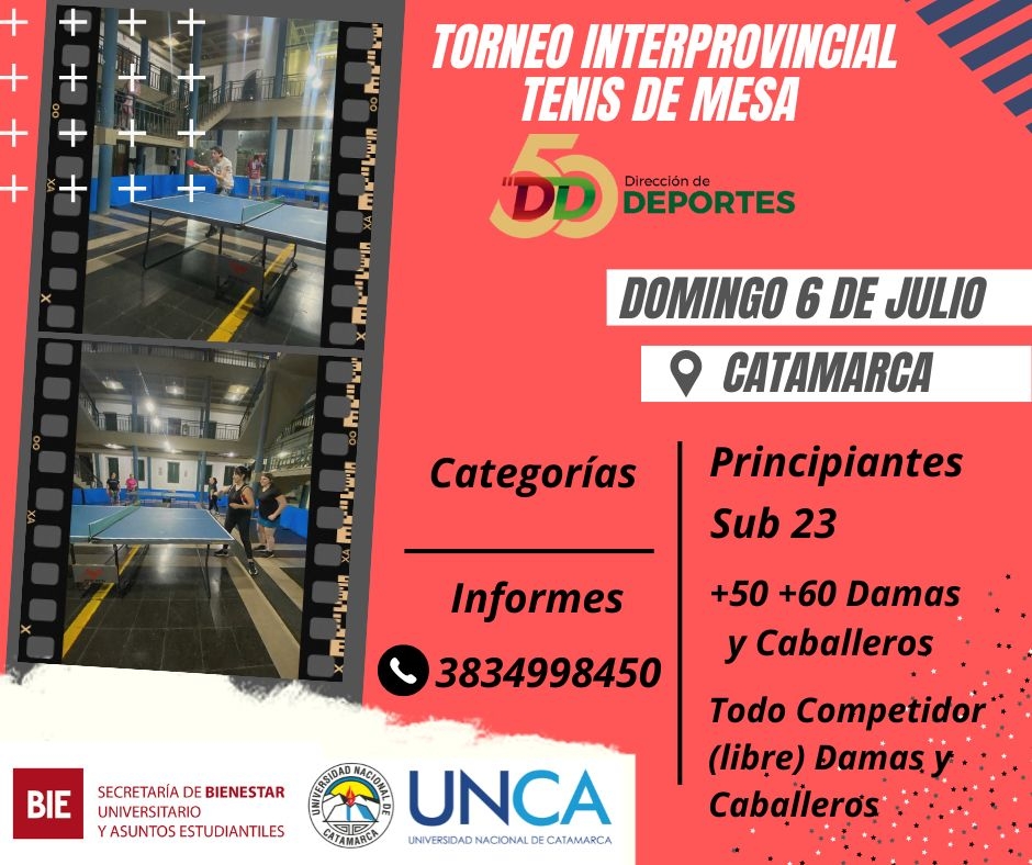 En el marco de los 50 años de la Dirección de Deportes de la UNCA, la Escuela de Tenis de Mesa invita a todos los jugadores de esta disciplina a participar del Primer Torneo Interprovincial de Tenis de Mesa a concretarse el domingo 6 de julio.