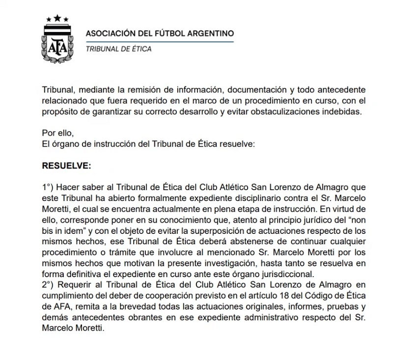 San Lorenzo deberá entregarle a la AFA sus pruebas contra Marcelo Moretti Además, la AFA, que reveló que su expediente disciplinario se encuentra "en etapa de instrucción", le pidió a San Lorenzo "todas las actuaciones originales, informes, pruebas y demás antecedentes" de su trabajo a fin de incorporarlos al suyo, "en cumplimiento del deber de cooperación previsto en el artículo 18 del Código de Ética".