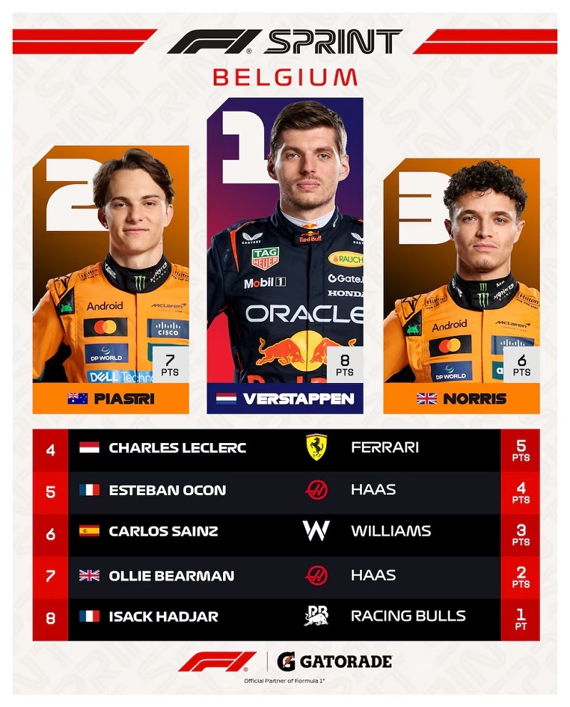 La cita rápida en Bélgica repartió puntos para los tres primeros, pero también para Charles Leclerc de Ferrari (5 puntos), Esteban Ocon de Haas (4), Carlos Sainz de Williams (3), Ollie Bearman de Haas (2) y Isack Hadjar de Racing Bulls (1).