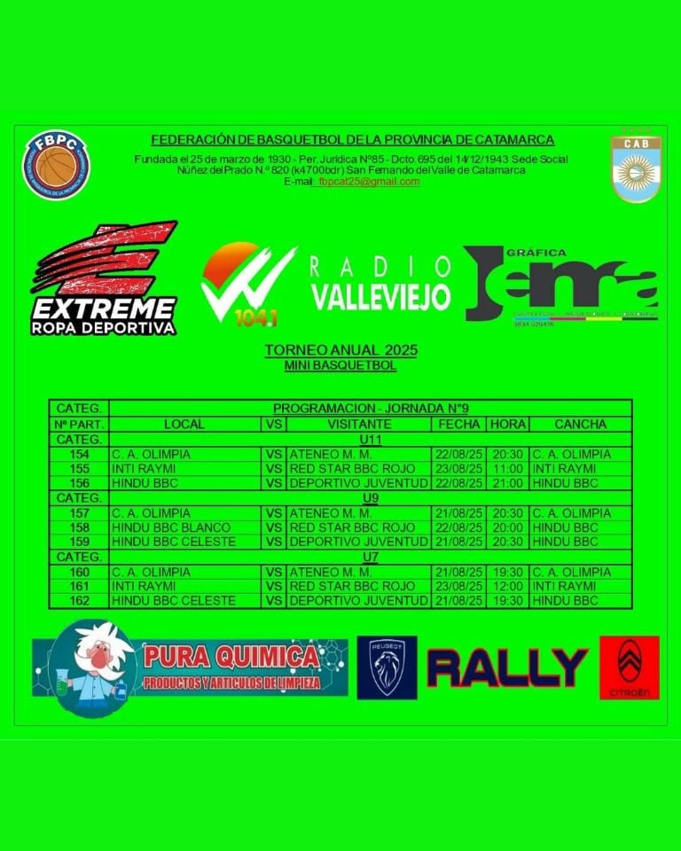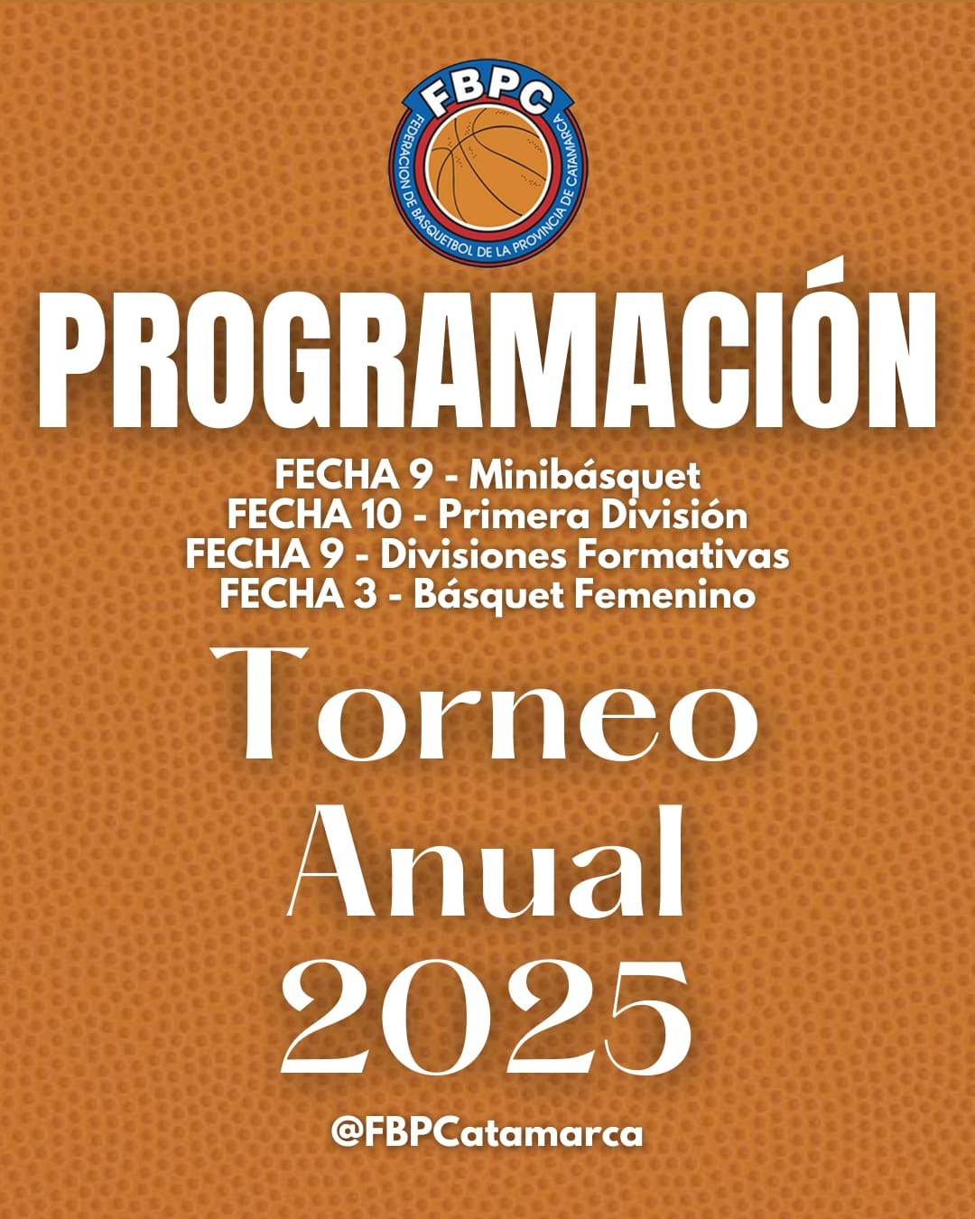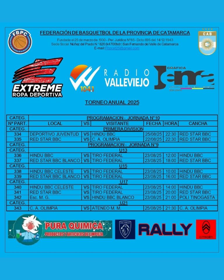 La Federación de Básquetbol de la Provincia de Catamarca confirmó la programación para sus Torneo Anual 2025 de Primera División, Divisiones Formativas, Minibásquet y Básquet Femenino, a desarrollarse desde este jueves 21 al lunes 25 de agosto.