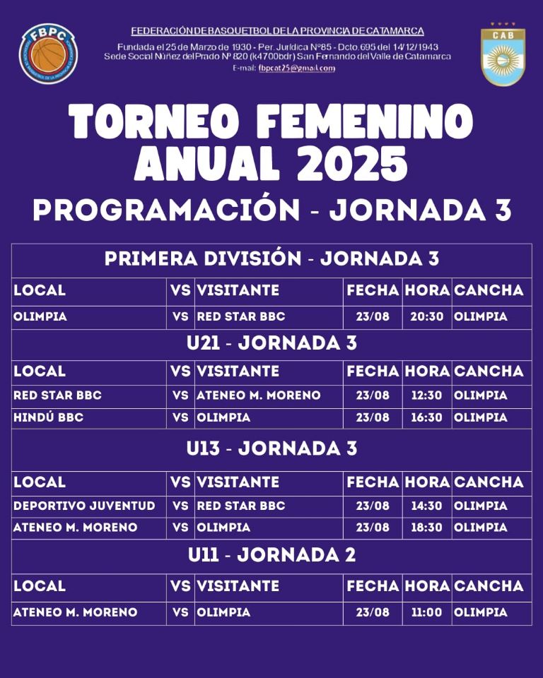 Este sábado, en el "Puyuyo Sánchez", el Básquet Femenino disputará su tercera jornada. Iniciará con la categoría menor, la U11, entre Ateneo vs Olimpia a las 11 hs. En la U13, se medirán Deportivo Juventud vs Red Star (14:30 hs) y Ateneo vs Olimpia (18:30 hs). La U21 tendrá también dos juegos: Red Star vs Ateneo (12:30 hs) e Hindú vs Olimpia (16:30 hs). Cerrará la jornada el partido de Primera División entre Olimpia vs Red Star, a las 20:30 hs.