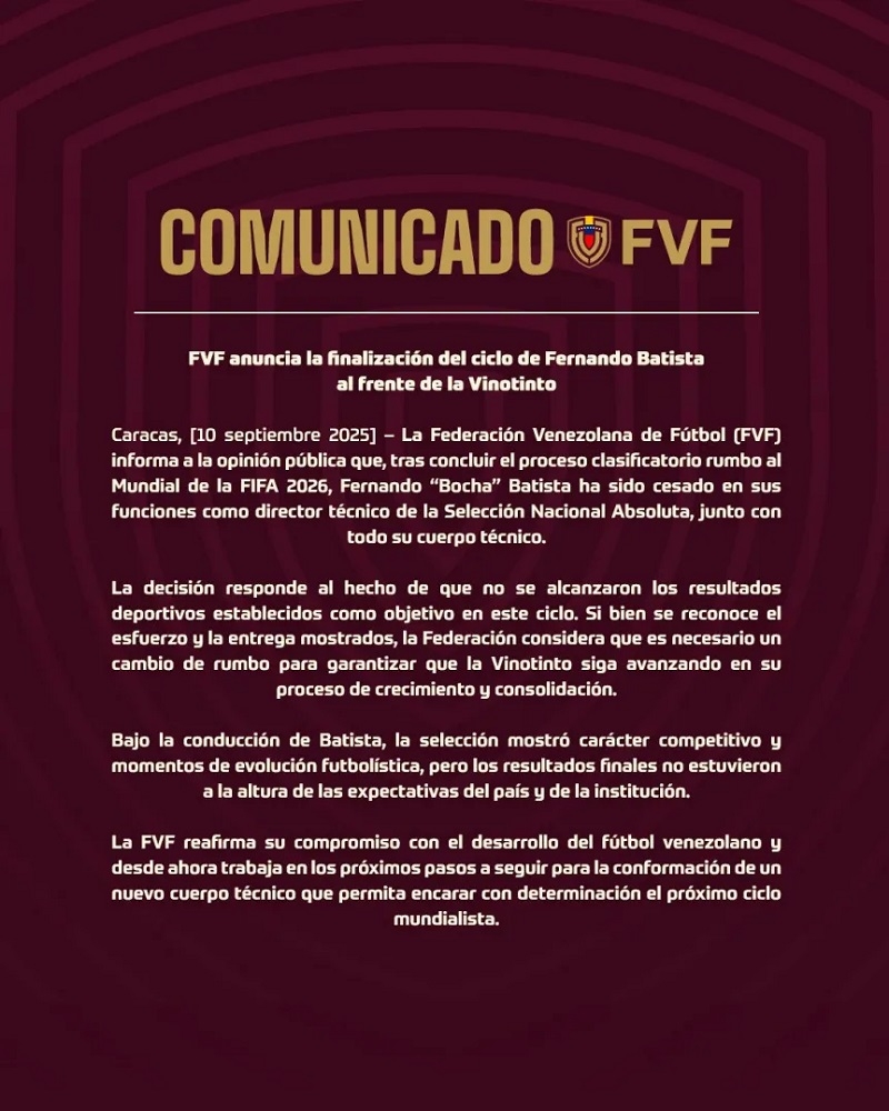 "La decisión responde al hecho de que no se alcanzaron los resultados deportivos establecidos como objetivo en este ciclo", explica el comunicado de Venezuela, en el que "reconoce el esfuerzo y la entrega mostrados". Pese a esta definición, desde la Federación aseguran que "es necesario un cambio de rumbo para garantizar que la Vinotinto siga avanzando en su proceso de crecimiento y consolidación".