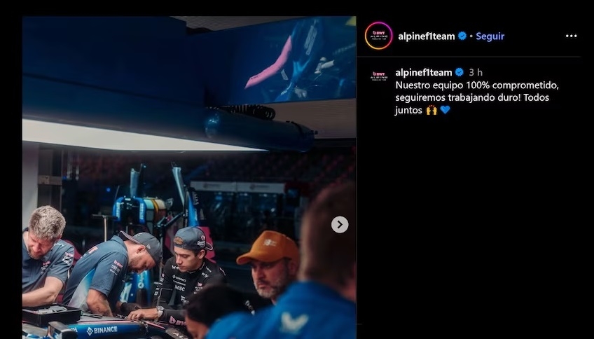 En una publicación acompañada de cuatro imágenes de Colapinto junto a los mecánicos, Alpine expresó: “¡Nuestro equipo 100% comprometido, seguiremos trabajando duro! Todos juntos”, en referencia a los esfuerzos realizados para reparar el monoplaza tras el accidente sufrido en la sesión clasificatoria.