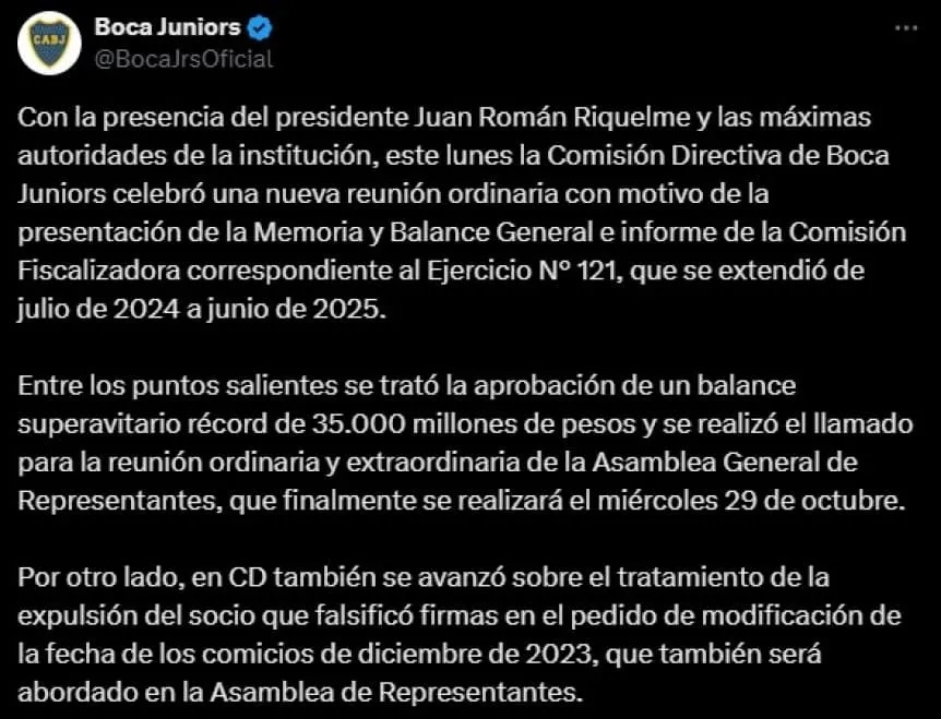 Con Juan Román Riquelme a la cabeza, la Comisión Directiva de Boca se reunió este lunes para presentar la Memoria y el Balance General y el informe de la Comisión Fiscalizadora del ejercicio que abarca desde julio de 2024 a junio de 2025.