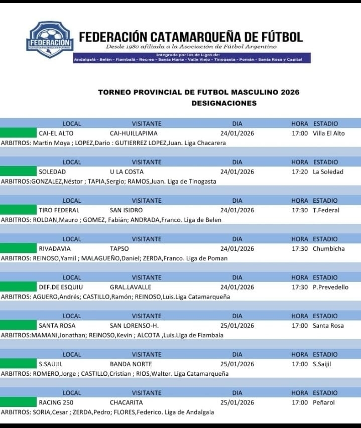17.20 hs., en cancha de La Soledad: Soledad, Liga Fiambalense, vs. Unión La Costa, Belén.