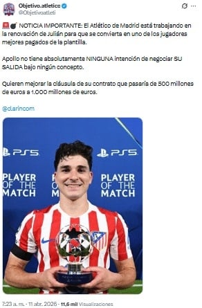 “El Atlético de Madrid está trabajando en la renovación de Julián para que se convierta en uno de los jugadores mejores pagados de la plantilla. Apollo, accionista mayoritario del Atleti, no tiene absolutamente ninguna intención de negociar su salida. Quieren mejorar su cláusula, que pasaría de 500 a 1000 millones de euros”, confirmaron desde Clarín.