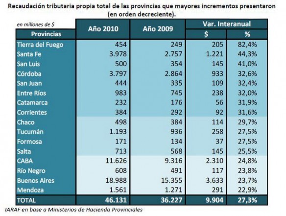 Con un crecimiento de sólo el 31,9% registrado en los nueve primeros meses del año en relación a igual período de 2009, la provincia ocupa el séptimo lugar de una lista con 16 administraciones federales (son las que tienen datos sobre recaudación de impuestos actualizados) que tiene a la cabeza a Tierra del Fuego, donde los recursos propios crecieron 82,4%, seguido de Santa Fe (+44,3%), San Luis (41%), Córdoba (+32,6%) y San Juan (+32,4%) en el top 5, según datos relevados por el Instituto Argentino de Análisis Fiscal (IARAF).
