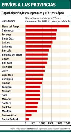 Los envíos automáticos a las provincias, por coparticipación y leyes especiales, incluido el Fondo Sojero, crecieron entre enero y noviembre el 38,4% respecto de igual período del 2009. Tierra del Fuego, Catamarca, Formosa y Santa Cruz fueron las provincias que mejor recaudación per cápita tuvieron de los recursos de origen nacional.