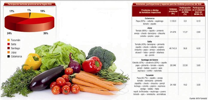Dentro del NOA, la provincia que más se destacó en su contribución tanto en volumen como en diversidad de hortalizas fue Salta (situación que se mantiene desde hace varios años) con un 38,8% del total de la región, que fue superior al del año anterior cuyo porcentaje era del 33,7%.