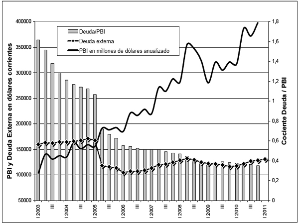 “A partir del segundo trimestre de 2005, con el canje de la deuda pública implementado por el Gobierno Nacional, el coeficiente deuda externa / PBI se redujo significativamente, pasando de un valor mayor al 100% al 62%\", explica el Informe de Balanza de Pagos difundido por el Indec.