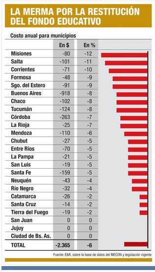 Las conclusiones pertenecen a un informe de la consultora Economía & Regiones, que sostiene además que la merma por la reinstauración de ese fondo educativo «representaría alrededor del 7% de la coparticipación municipal y el 3% de los recursos anuales, ambas cifras estimadas en forma previa a la reforma».